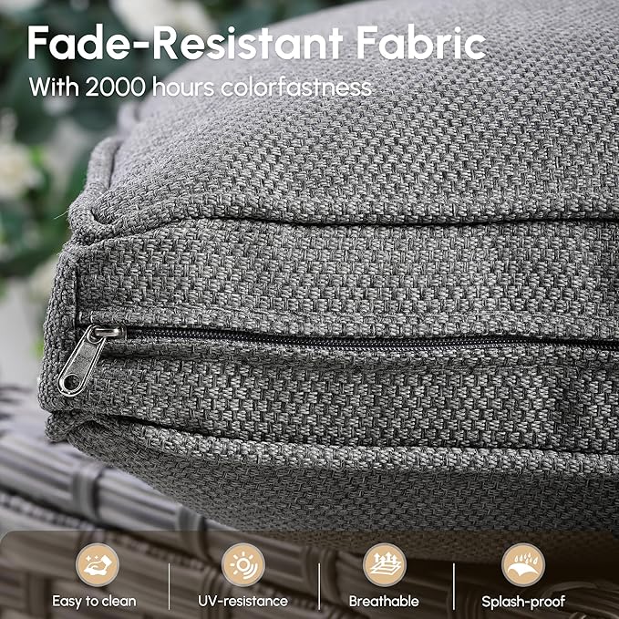- Built to Last:This patio seating set is engineered for longevity and crafted with premium materials to ensure maximum durability. The robust metal frame is thicker than most, supporting up to 400 lbs, and features a premium-grade coating that resists scratches, peeling, and rust. The hand-woven all-weather PE wicker is built to withstand rain, tears, and fading, ensuring it looks fresh season after season. Additionally, the premium cushion fabric uses advanced 100% solution-dyed technology, making it highly resistant to water, spills, and stains while keeping colors vibrant for years. This set combines style and durability for a long-lasting outdoor retreat