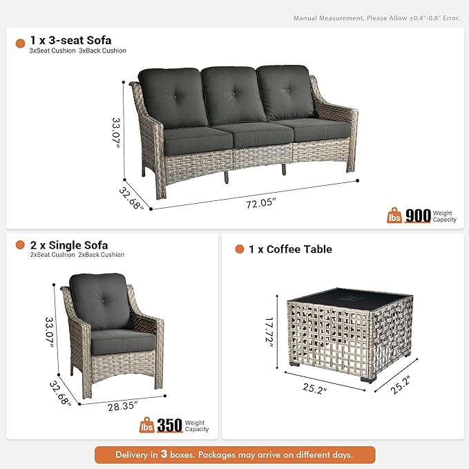 - Low Maintenance: Enjoy the ease of assembly with this patio furniture, complete with all the tools you need. The weather resistant materials make maintenance a cinch, while the splash proof design keeps your patio outdoor sset and sofa set looking fresh
