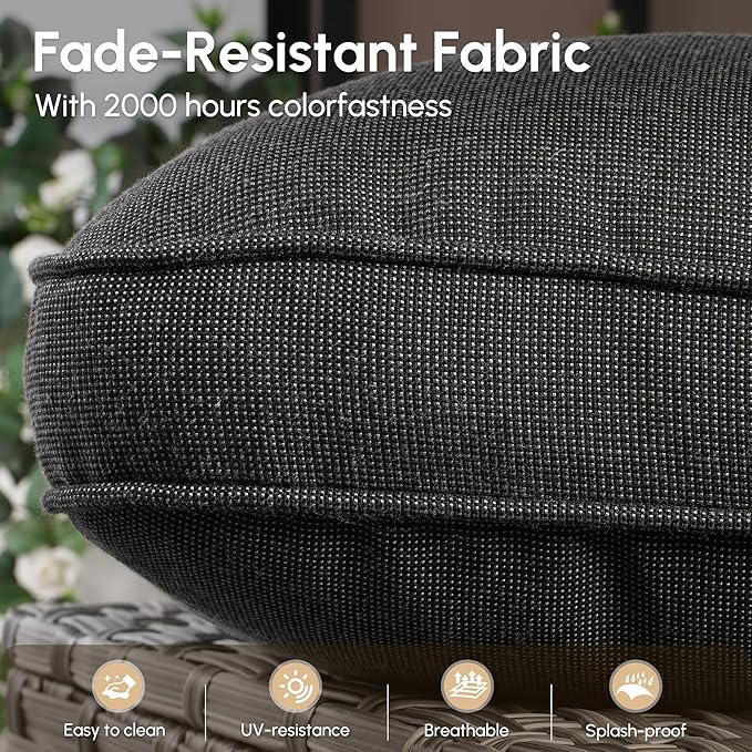 - Built to Last:This patio seating set is engineered for longevity and crafted with premium materials to ensure maximum durability. The robust metal frame is thicker than most, supporting up to 400 lbs, and features a premium-grade coating that resists scratches, peeling, and rust. The hand-woven all-weather PE wicker is built to withstand rain, tears, and fading, ensuring it looks fresh season after season. Additionally, the premium cushion fabric uses advanced 100% solution-dyed technology, making it highly resistant to water, spills, and stains while keeping colors vibrant for years. This set combines style and durability for a long-lasting outdoor retreat