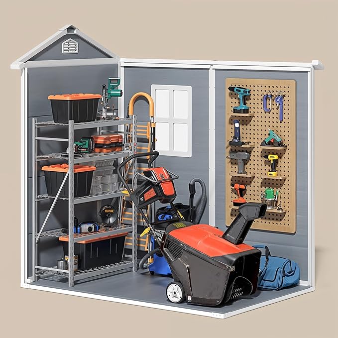- High Quality Materials: This backyard storage shed is made of 14 mm-thick double-layer resin flooring and walls with hardwearing ABS corner guards at the joints, which not only greatly enhances the stability of the tool shed but also provides excellent load-bearing capacity. The double-layer panels are waterproof, rustproof, UV resistant, not easy to bend and puncture, support all-weather use, enhanced internal insulation to keep the temperature stable