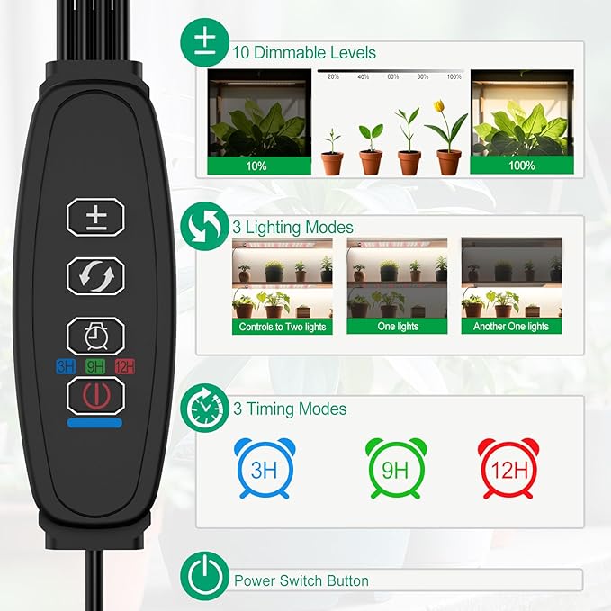 - 【3 Lighting Modes & 10 Dimmable Option】: 3 lighting modes:individual, combined, or alternate granting flexible control over light coverage. 10 dimmable options (ranging from 10% to 100%); With a range of 6000 lumens, ensure your plants receive the precise light intensity they need for improved care and growth.