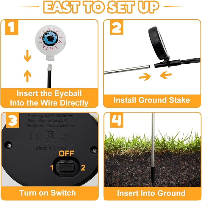 - Power Source: Halloween eyeball pathway lights are fully solar powered, which are equipped with high-quality adjustable solar panel and a 180 degree dimming angle for sunlight. Charge for 6-8 hours during daytime and auto light up for 8-10 hours at night. Please turn on the switch before charging and keep it on when you use them