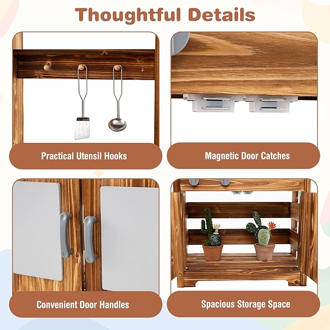 - Designed for Safety & Convenience: Crafted from solid cedar wood for durability and aesthetic appeal, our mud kitchen features smooth rounded corners and a stable base to ensure safe play. Besides, thoughtful details like the spacious storage space, practical utensil hooks and door handles provide added convenience for children's play.