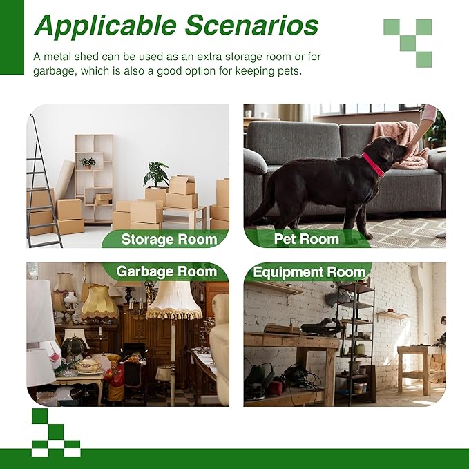 - [Practical and Safe Galvanized Steel Garden Shed] 119''(L) x 98.3(W) x 7.2(H), storage shed has reinforced galvanized metal frame which is rust-resistant, and two firm lockable doors, which can protect your personal stuff safely.
