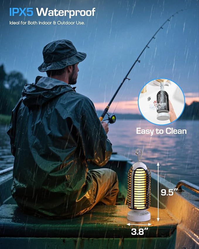 - IPX5 Waterproof & Easy to Clean: Built with an IPX5 waterproof rating, this portable mosquito zapper outdoor handles rainy conditions with ease for safe, reliable outdoor use. The bug zapper outdoor cordless features a magnetic hook for easy hanging or stable placement on flat surfaces. The small brush makes this fly killer easy to remove insects stuck to the grid. Note: Do not immerse in water. Whether indoors or outdoors, keeping bothersome insects at bay is effortlessly achievable.