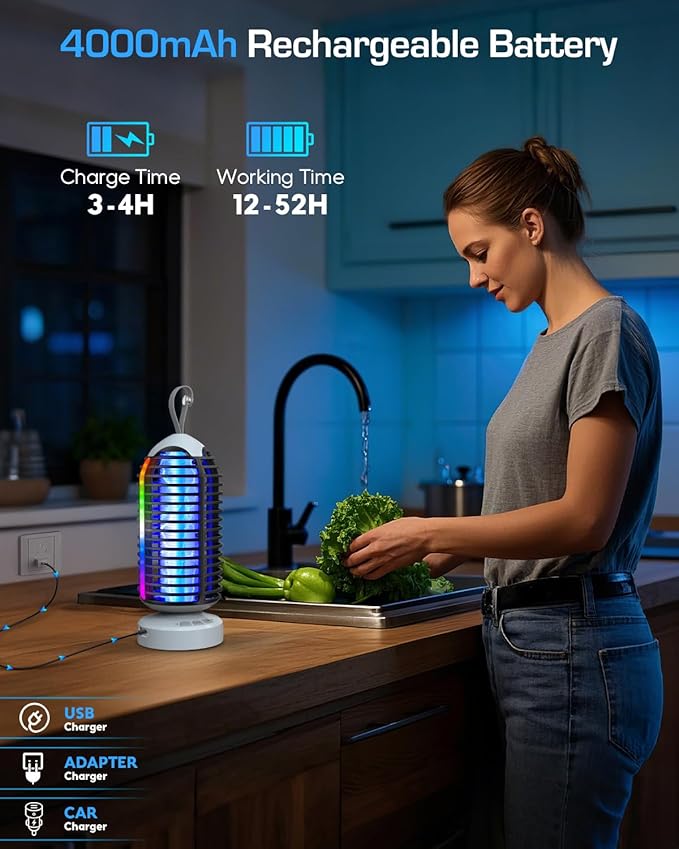 - 4000mAh Rechargeable Battery: This indoor fly zapper features a high-capacity 4000mAh battery, offering extended runtime: 12–16 hours in mosquito light mode, 7–18 hours in night light mode, and 17–52 hours in ambient light mode.With quick USB-C charging, it takes just 3-4 hours to fully recharge. Enjoy the freedom of cordless operation—whether at home or on the go, its portable, cordless design ensures continuous mosquito protection, letting you sleep peacefully without interruption.