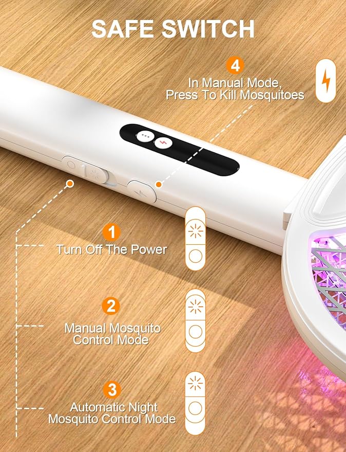 - Dual Mode: Switch easily between manual mode and automatic mode. In automatic mode, the built-in blue light (360–400nm wavelength) attracts mosquitoes effortlessly, turning your electric fly swatter into a hands-free bug zapper. Perfect for day or night protection.