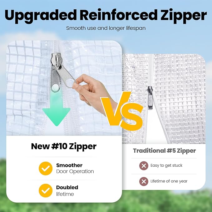 - [UVI 6 Protected Cover]--Waterproof 150g/sqm PE grid cover is UV Index 6 protected, protects your plants from excess rays, which doubles the service life: Compared to other greenhouse(UVI 1-3) that only lasts for 1-6 months, the KING-cover lasts for over years. The reinforced odorless PE covering material provides safe work zone. The cover fits the frame closely, enhancing warmth and wind resistance.