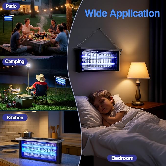 - 【Widespread Bug Defense】Equipped with 2 high-efficiency LED lamps and a powerful 3,500V shock grid, our bug zapper is able to effectively cover 3,000 sq.ft, attract and control mosquitoes, flies, moths, gnats and more with ease, keeping your family safe from annoying flying insects.