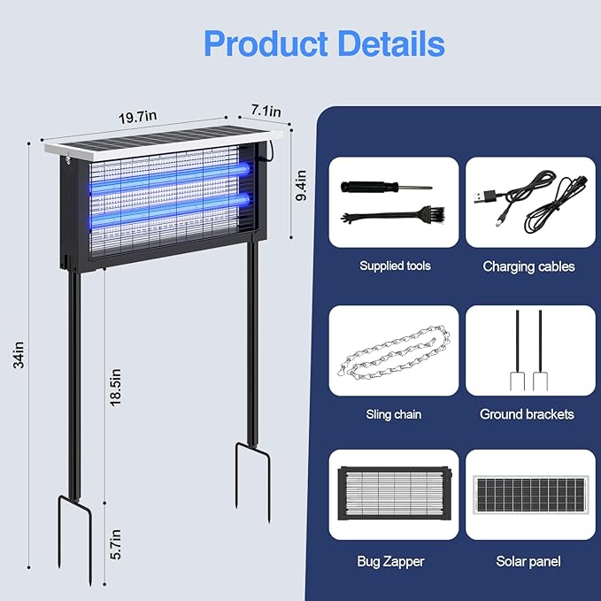 - 【Dual Charging Mode】Our mosquito zapper features a premium glass solar panel (daytime charging + night activation) for outdoor use, energy saving and convenient. Additionally, it can be charged by the included USB cable in 3 hours, also suitable for cloudy weather and indoor use.