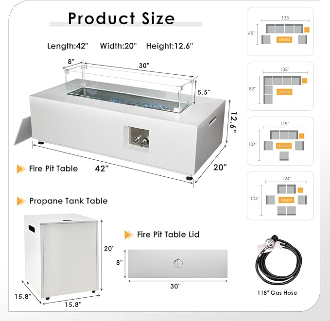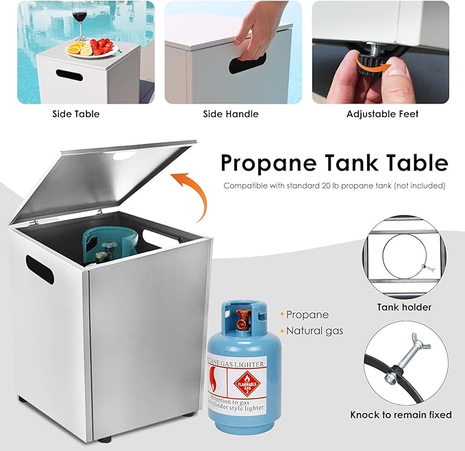 - Package Includes: This set includes everything you need for a complete outdoor experience; It comes with a fire pit table, a propane tank table suitable for a 20lb propane tank (tank not included), a waterproof rain cover for weather protection, a glass wind guard to reduce wind interference, 8.8 lbs of blue fire glass beads to enhance the flame’s glow, a gas & propane convertible valve for duel fuel options, and adjustable feet to ensure a level setup on uneven surfaces