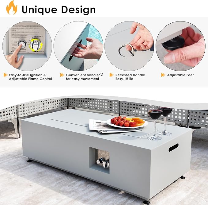 - 3-In-1 Versatility: Designed for flexibility, this fire pit supports both propane and natural gas; Enjoy it three ways—ignite the fire for warmth, add the glass wind guard for a steady flame, or place the sleek lid to transform it into a spacious coffee or dining table; The lid’s built-in pull ring ensures easy handling, while integrated hand slots on both sides allow for effortless lifting and repositioning