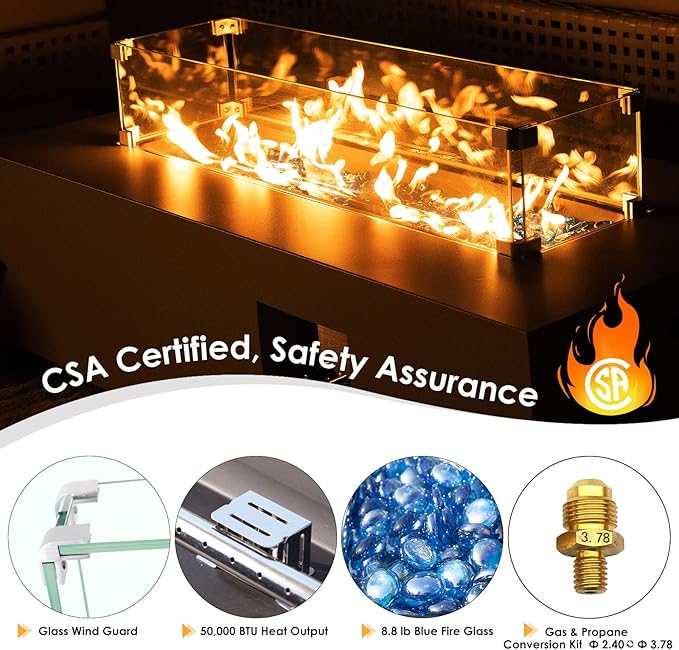 - Reliable & Even Distribution: Holding CSA certification, this fireplace ensures safe use for peace of mind; Equipped with a durable stainless steel burner, rated at 50,000 BTU, it delivers ample warmth and effectively radiates heat to surrounding seating areas, ensuring everyone stays cozy, whether gathered for conversation or roasting marshmallows; The push-button spark ignition makes lighting effortless, while the chrome manual control valve allows for adjustable flame height