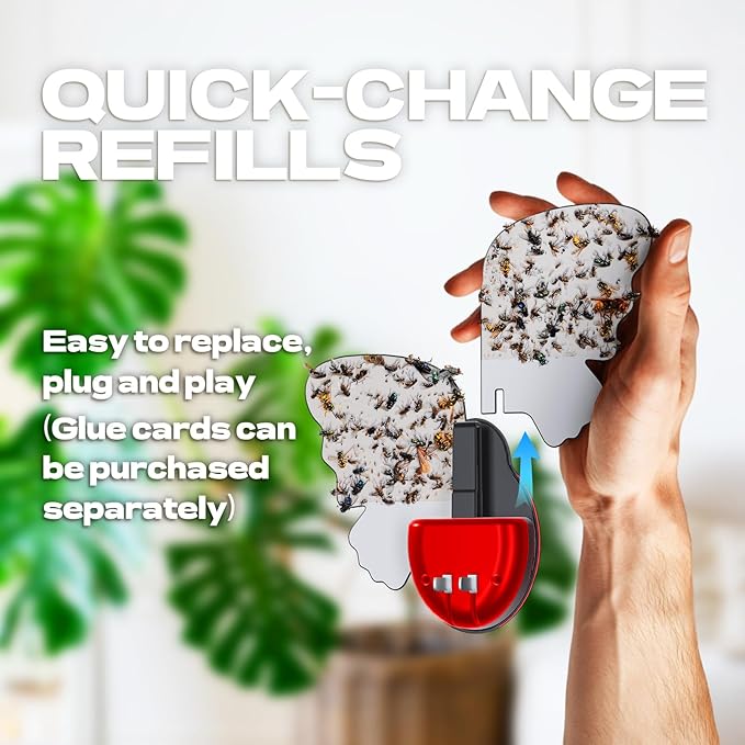 - PACKAGE DETAILS - 1 plug-in fly trap, 3 pair of glue cards. Reusable, and glue cards can be purchased separately.