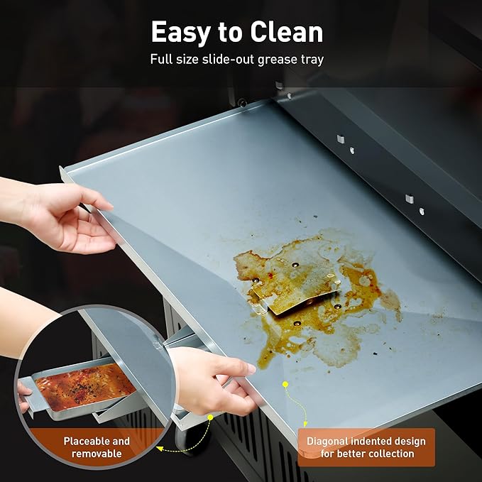 - Special Feature : Built-In Thermometer, Enclosed Cabinet, Heavy Duty, Removable Grease Tray, Warming Rack