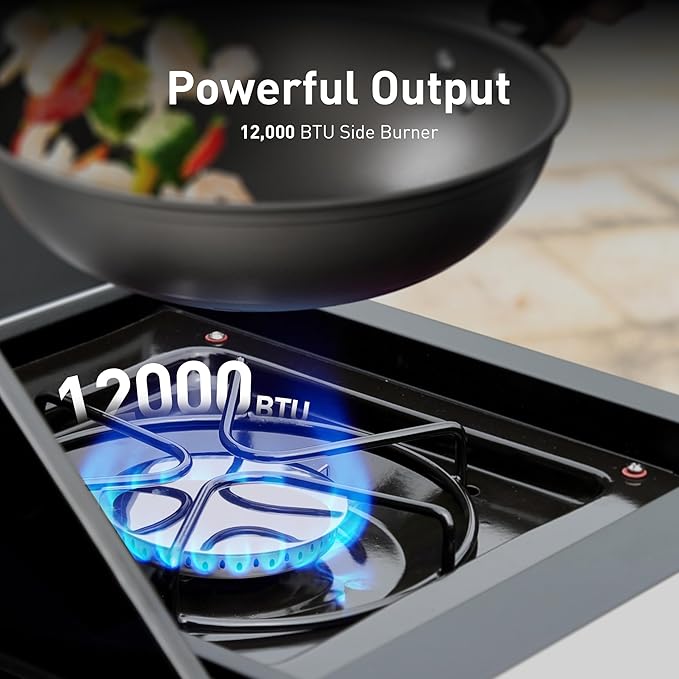 - 【Powerful Gas Grill with Side Burner】4 stainless steel burners (8,000 BTU each) and a 12,000 BTU side burner deliver 44,000 BTU of even heat for versatile outdoor cooking—perfect for your outdoor kitchen grill setup