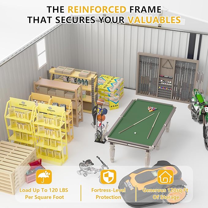 - ๐ก๐๐๐ข๐ง๐๐จ๐ซ๐๐๐ ๐๐ญ๐ซ๐ฎ๐๐ญ๐ฎ๐ซ๐: There's nothing more frustrating for gardeners than a collapsed garden tool shed. Luckily, this large sheds & outdoor storage 10x12 features upgraded reinforced windproof ground stakes and steel frame, with a roof that supports up to 120 lbs/ftยฒ. The 0.25mm thick steel plates are coated with high-quality paint, making it rust, UV, and moisture-resistant, ensuring durability and the ability to withstand harsh weather for at least 10 years.