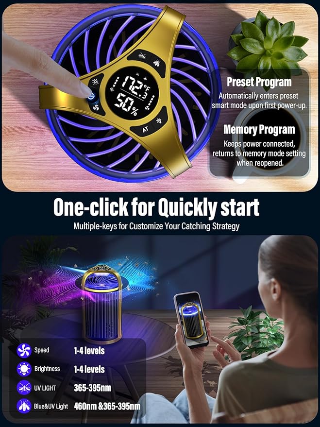 - 【Intelligent Function】- This indoor fly trap features a quick smart switch with built-in preset and memory functions for one-button operation, plus additional buttons for custom settings. It includes dual insect capture modes, adjustable fan speed and brightness, an automatic mode, and a multi-colored decorative night light function. In automatic mode, it operates intelligently at night and shuts off during the day, providing both convenience and customization