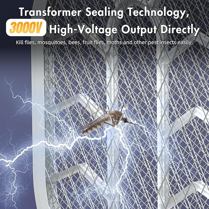 - Efficient Mosquito Zapper: Electric fly swatter racket features a 3000V high-voltage grid with a built-in 1800mAh battery compartment that charges separately on the dock. It must be powered via dock or Type-C cable and exclusively operates in auto zapping mode, ensuring seamless indoor/outdoor protection.