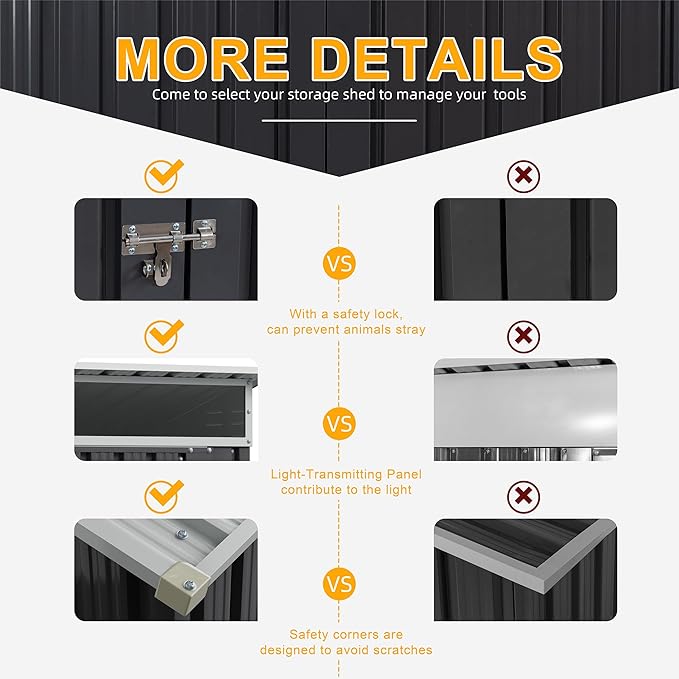 - 【Secure and Lockable】The garden shed's lockable doors safeguard your belongings, preventing theft and unauthorized access. Compatible with locks,it offers reliable security and peace of mind for your tools and items.