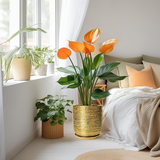 - Size of Ceramic Planter: Each indoor plant pot is 9.5” in outer diameter and 10.8” in height. The optimal size makes gold planter an ideal home for planting monstera, money tree, ficus lyrata, olive tree, bonsai