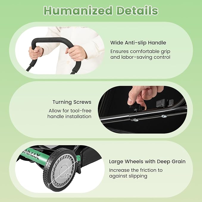- 【Foam Grip & 10" Wheel】The foam-padded U-shaped handle provides a comfortable grip, making the mowing experience more enjoyable. Plus, the 10" wide wheels feature non-slip texture for steady rolling. Without the need for fuel or electricity, the push lawn mower reduces maintenance.