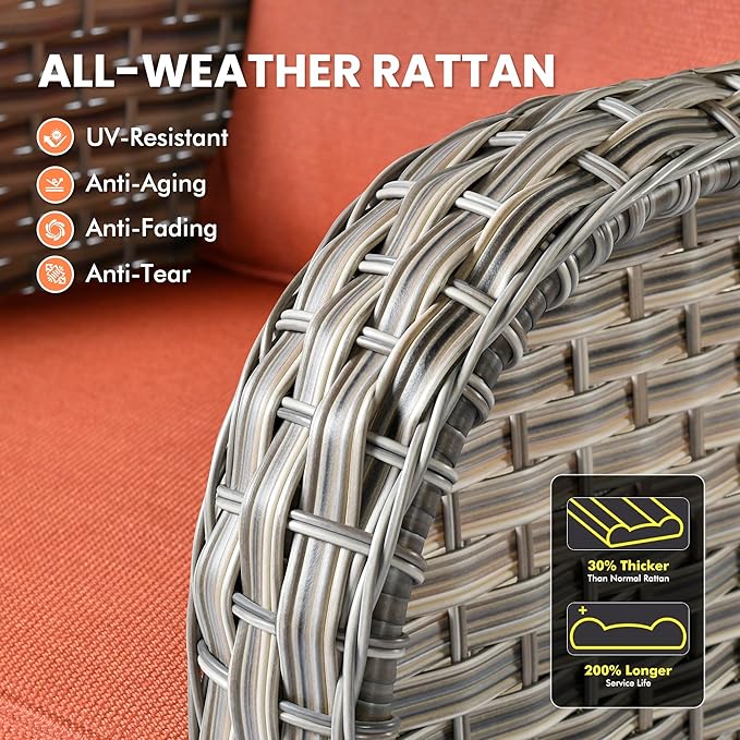 - All-Weather Patio Modular Sectional Sofa Set:Built to last, our All-Weather Patio Modular Sectional Sofa Set is crafted with premium, handwoven PE rattan, designed to withstand rain, snow, and blazing sun. Whether hosting guests or relaxing solo, this patio conversation set — including the outdoor sofa and chair — resists stains and is water-repellent, ensuring effortless maintenance for a pristine backyard oasis