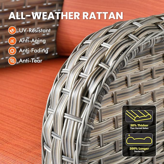 - All-Weather Patio Modular Sectional Sofa Set:Built to last, our All-Weather Patio Modular Sectional Sofa Set is crafted with premium, handwoven PE rattan, designed to withstand rain, snow, and blazing sun. Whether hosting guests or relaxing solo, this patio conversation set — including the outdoor sofa and chair — resists stains and is water-repellent, ensuring effortless maintenance for a pristine backyard oasis