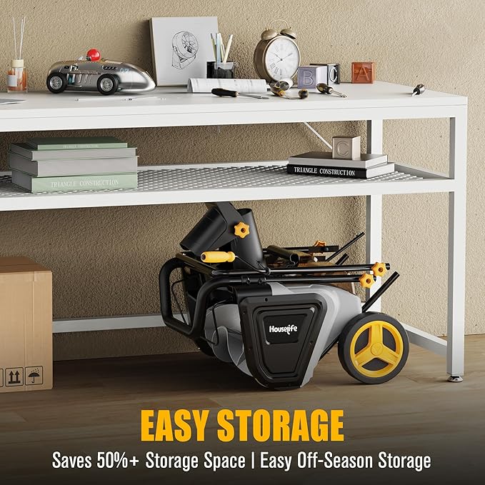 - LIGHTWEIGHT & COMPACT STORAGE: The lightweight and ergonomic design of this electric snow blower ensures easy handling and maneuverability for all users on driveways, patios, and sidewalks. Its compact, detachable, and foldable design allows for space-saving storage in any garage or shed, making it a convenient and easy-to-store solution year-round.