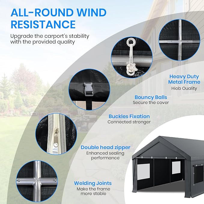 - 【Heavy Duty Stability Frame】This carport shelter is constructed with a rust-resistant galvanized steel frame that prevents rust, and corrosion. Featuring 8 legs comprising thick steel poles, the metal carport 10x20 can be safe from harsh weather conditions, and 4 sturdy windproof ropes and 16 ground stakes make the whole steel carport more stable