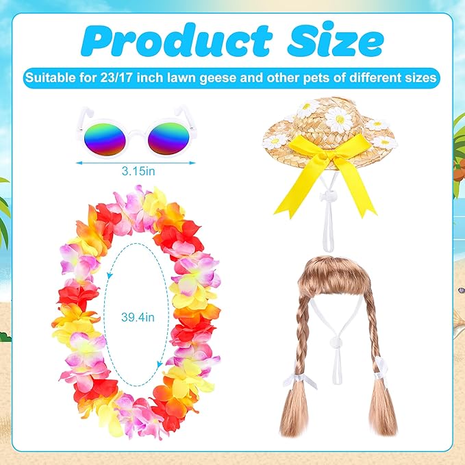 - Package Includes: Our summer porch goose outfit set contains a Hawaiian lei, a straw hat, a wig, a pair of glasses, complete accessories, easy to wear or take off, allow your goose statue to enjoy the summer look and enhance the lively elegance of outdoor decor.