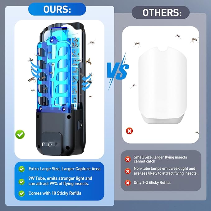 - 【Convenience & Efficiency】Plug-in indoor mosquito trap design is compatible with standard sockets, eliminating the need for complex installation steps. Flying insect trap comes with a replacement kit of 10 sticky glue cards, and it only takes 3 seconds to replace the glue cards. Each card can be used continuously for 15 to 90 days. It supports 24-hour uninterrupted operation, covering an area of 20 to 30 square meters for pest and disease control, reducing the cost of repeated purchases