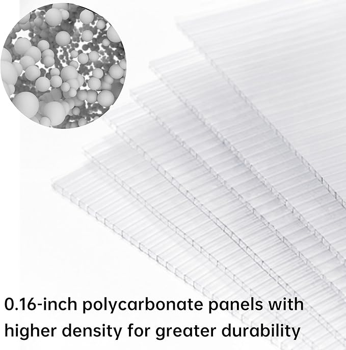 - POLYCARBONATE GREENHOUSE: Elevating humidity with superior insulation, transparent polycarbonate panels make our greenhouse ready for outside conditions. They allow in nourishing sunlight while still blocking scorching UV.