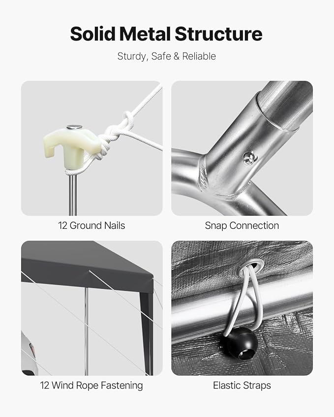 - Stable Structure: The tarp of the car canopy is secured with elastic ropes, while snap-together parts and ground stakes keep the base fixed. Full welding between pipes enhances the overall stability of the frame, improving its wind resistance.