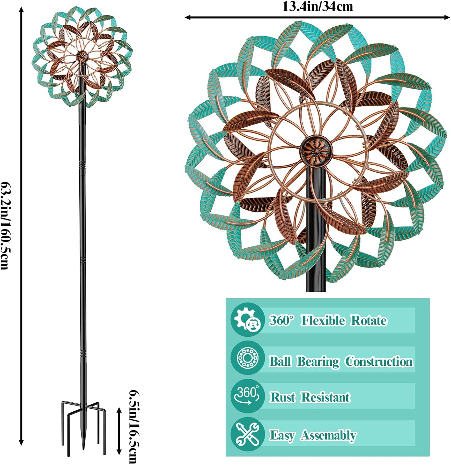 - Unique Kinetic Wind Spinner: Extra large 13.4" wide and 63.2" high, 4 tiers blades(2 large+ 2 small layer yard spinner). Dual sided rotating blades with dual direction wind motion, 4 tiers blades smoothly rotate in opposite directions on sealed bearings. and with its 360 degree rotation, adding a more dramatic look