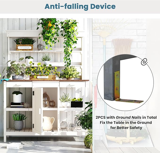 - 【Built-In Stability & Safety】: Garden anywhere with confidence! Uneven ground is no problem for this potting bench. We've included an anti-tipping device to easily secure the bench to a wall, ensuring stability and safety, even on slightly uneven surfaces. Focus on your gardening, not on wobbling furniture!