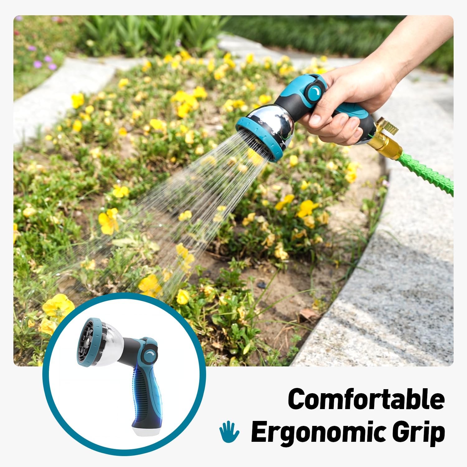 - ERGONOMIC PISTOL GRIP: The soft rubberized no-slip grip makes this sprayer comfortable to hold for long periods of time. Don't get your hand burnt when grabbing one of those bare metal nozzles that were left in the sun on a hot summer day neither should your hands freeze in pain when holding them on a cold winter day. This molded rubber nozzle with its ergonomic design has an insulated grip and is comfortable in hand.