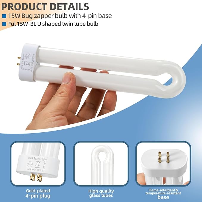 - Bug Zapper Replacement Bulb: 15W Bug zapper bulb with 4-pin base, Ful 15W-BL U shaped twin tube bulb for T6 insect attracting lamp. Replacement bulb Size: 7.48" L x 1.78" W x 0.93" H. (Please measure and confirm the bulb size of the original bug zapper before purchasing.)