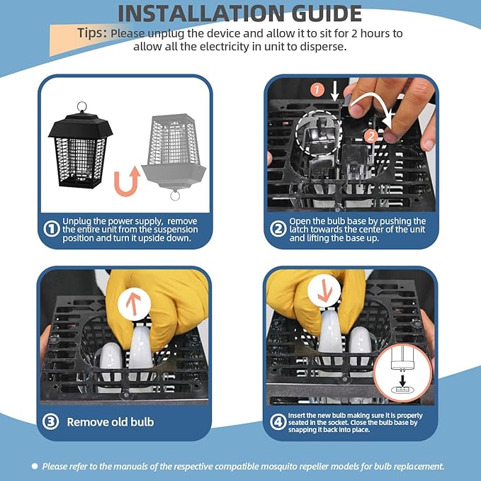 - Easy To Install: If you need to replace bug zapper light bulb, please unplug the device and allow it to sit for 2 hours to allow all the electricity in unit to disperse. To ensure that bug zapper outdoor are effective in attracting flying insects, the zapper bulbs should be replaced every season for for maximum effectiveness.
