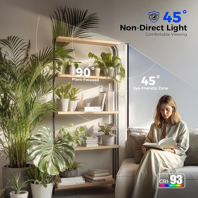 - Low-Glare Side Illumination with CRI 93 : Designed for dual use, T1S combines functional plant lighting with comfortable brightness. Its 45° npn-glare design and side illumination technology minimize eye strain when viewed from the side, while high CRI ensures color rendering—brightening living spaces without harsh glare
