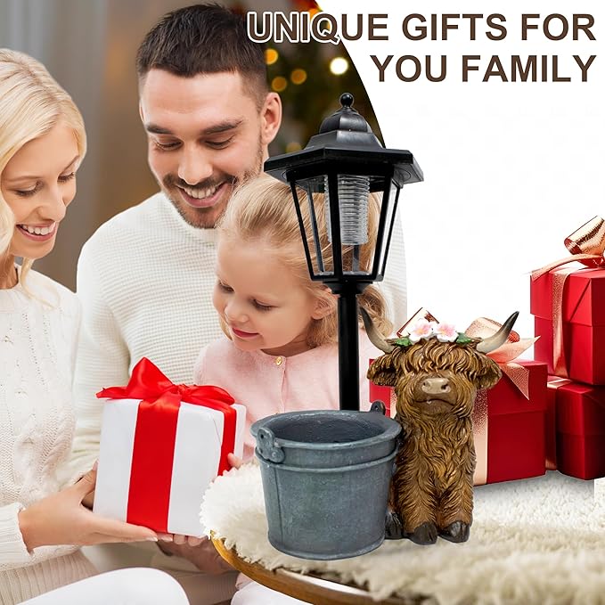 Highland Cow Statues Outdoor Solar Sculptures with Solar Lights and Flowerpot Funny Garden Decor Animal Figurines Resin Outdoor Statues for Patio Yard Lawn Balcony Grandma Mom Gifts