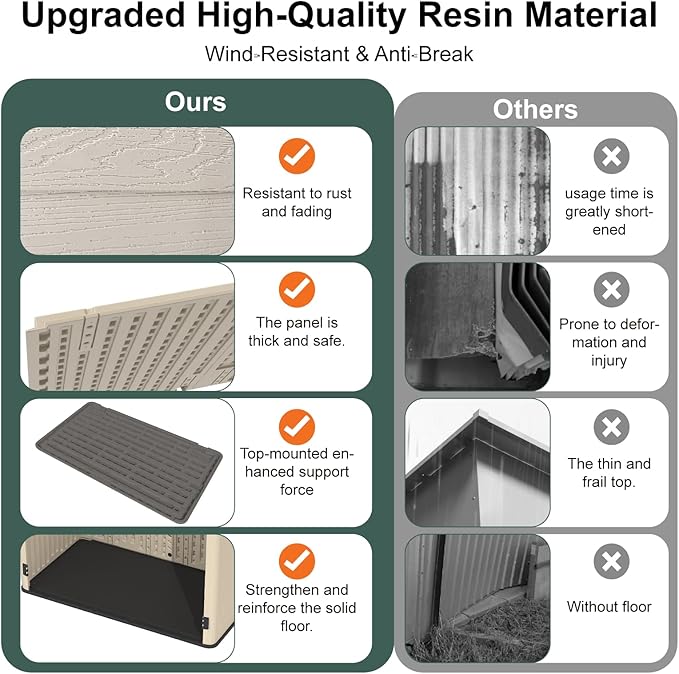 - All-Weather Resin Construction: Built with durable, waterproof resin, this shed withstands rain, snow, UV rays, and temperature fluctuations. The lockable, reinforced floor ensures the security of your property.