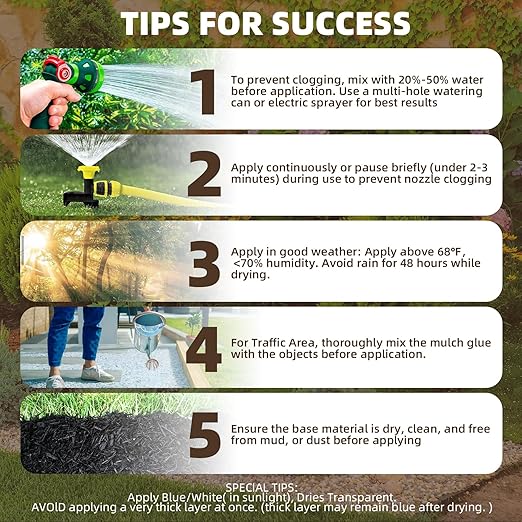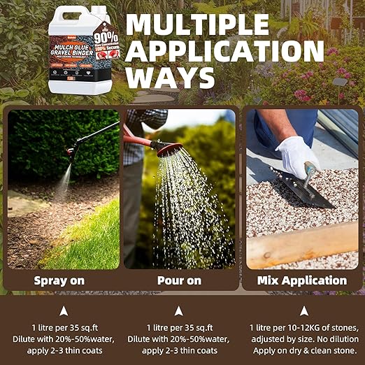 - 【Easy-to-Apply Mulch Glue】Simply shake and spray with any standard garden sprayer for quick, mess-free application on pea gravel, wood chips, or decorative stones. For best results on fine mulch, mix with 20-50% water before spraying, then lightly rake and apply 2-3 coats(Keep each layer ≤1 inch thick)for unbeatable erosion control and long-lasting hold.