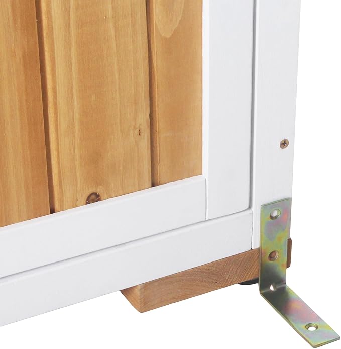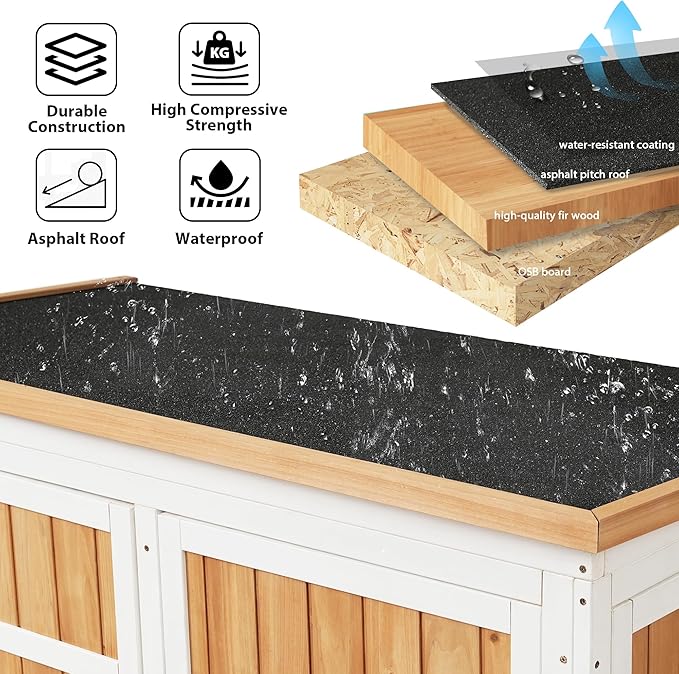 - 🌲【Durable and Robust Material】 In terms of durability, this cabinet is made from high-quality fir wood as well as OSB board. It has high compressive strength, making it less prone to crushing or cracking under pressure. Its reinforced corners and robust frame make it able to withstand wear and tear for years. Moreover, the tilted asphalt pitch roof and water-resistant coating keeps the item dry and free from moisture and rain, maintaining the cleanliness and overall condition