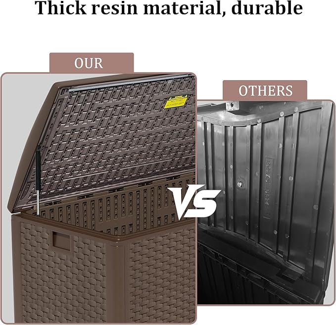 - Weatherproof Resin for Year-Round Use. Durable, waterproof resin, this deck box resists rain, sun, and UV exposure. Ideal for all-season use, it wonât peel, rust, or warp like wooden or metal boxesâkeeping your items protected outdoors.