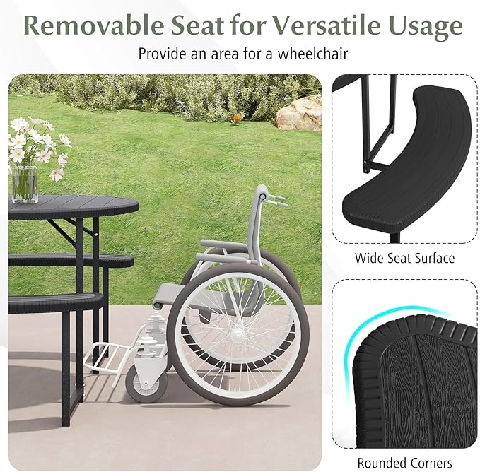 - [Removable Seat for Versatile Usage]: Designed with flexibility in mind, one of the four curved seats can be easily removed to accommodate wheelchair access. The wide seat surfaces feature rounded corners for safety, enhancing versatility for gatherings of 8 people.