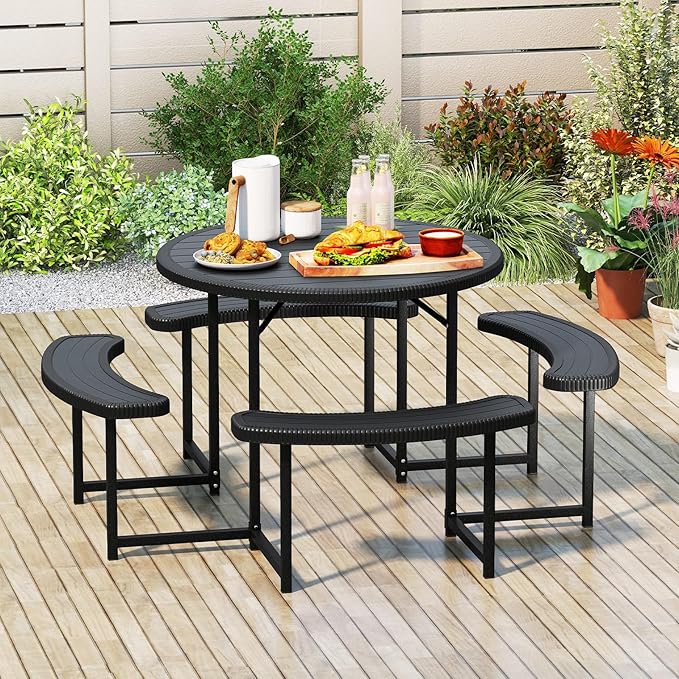 - 4-8 People Outdoor Dining Set: The 37" round picnic table comes with 4 curved seats for 4-8 people. Furthermore, one seat can be removed to facilitate wheelchair accessibility. Whether hosting a barbecue or enjoying a cozy outdoor meal, the picnic table is the perfect centerpiece for your gatherings.