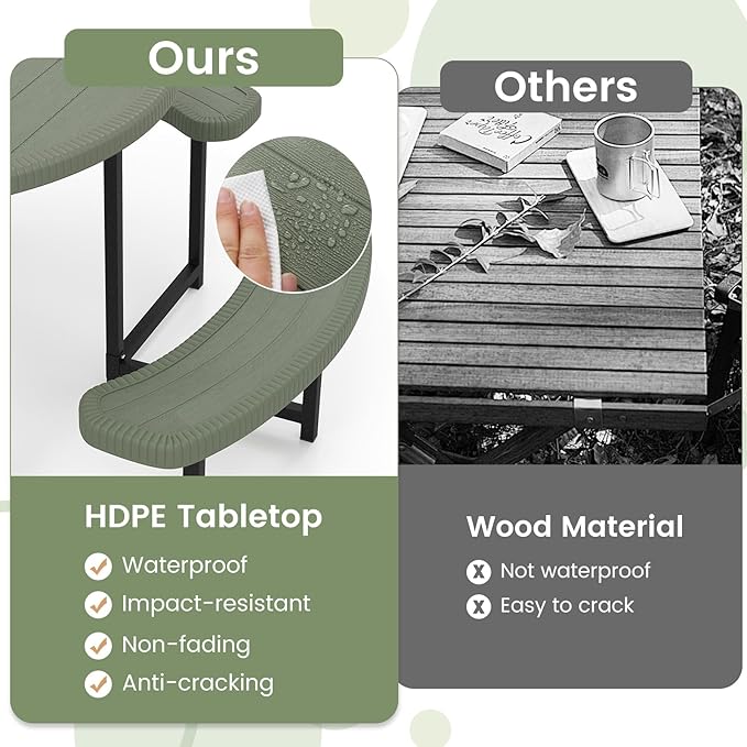 - 4-8 People Outdoor Dining Set: The 37" round picnic table comes with 4 curved seats for 4-8 people. Furthermore, one seat can be removed to facilitate wheelchair accessibility. Whether hosting a barbecue or enjoying a cozy outdoor meal, the picnic table is the perfect centerpiece for your gatherings.