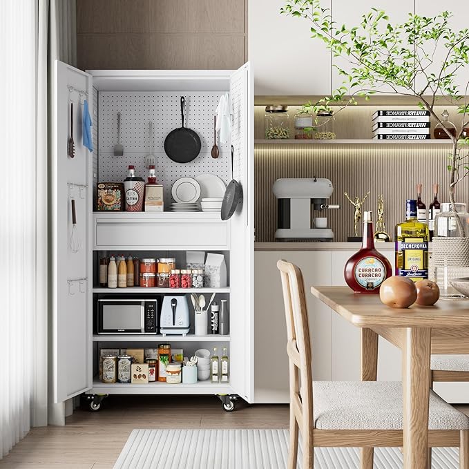 71" H Metal Garage Storage Cabinet with Wheels and Doors,Rolling Tool Cabinet with Pegboard,Rod and Drawer for Garage Warehouse Home,Required Assembly,White