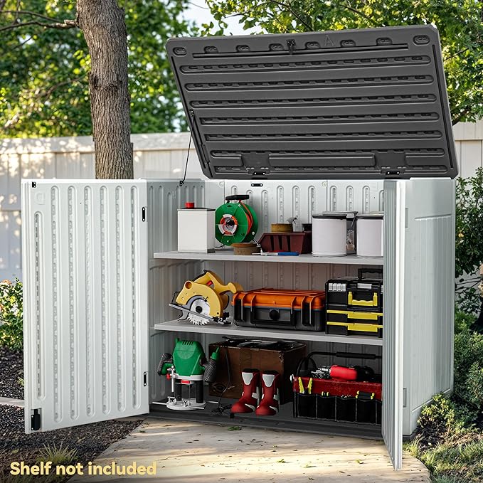 - Robust Construction: Boasting double-wall resin panels treated with cutting-edge technology, this outdoor storage solution offers enhanced wind and impact resistance; Its sturdy build ensures your valuable tools and equipment remain secure, without bending or puncturing